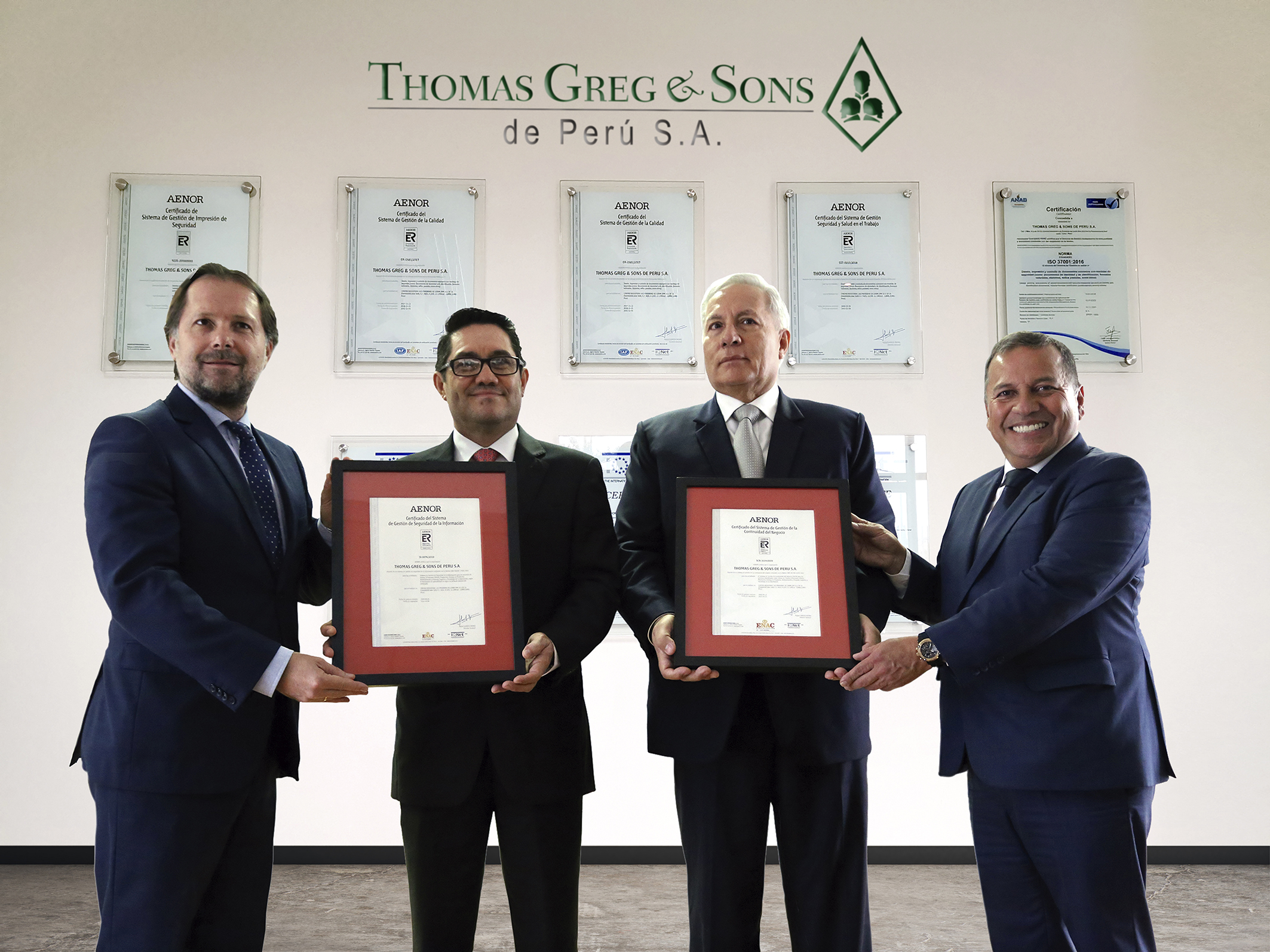 Acorde con ello, Thomas Greg & Sons de Perú S.A. (TGS), empresa líder en brindar soluciones integrales de seguridad, con 22 años de experiencia, se convierte en la primera empresa en lograr 7 certificaciones internacionales de gestión con la Normas ISO 9001:2015 Gestión de Calidad, ISO 14001:2015 Gestión Ambiental, OHSAS 18001:2007 Gestión de Seguridad y Salud Ocupacional, ISO 14298:2013 Gestión de Seguridad de la Impresión, ISO 37001:2016 Gestión Antisoborno, ISO 27001:2013 Gestión de Seguridad de la Información e ISO 22301:2012 Gestión de Continuidad del Negocio.