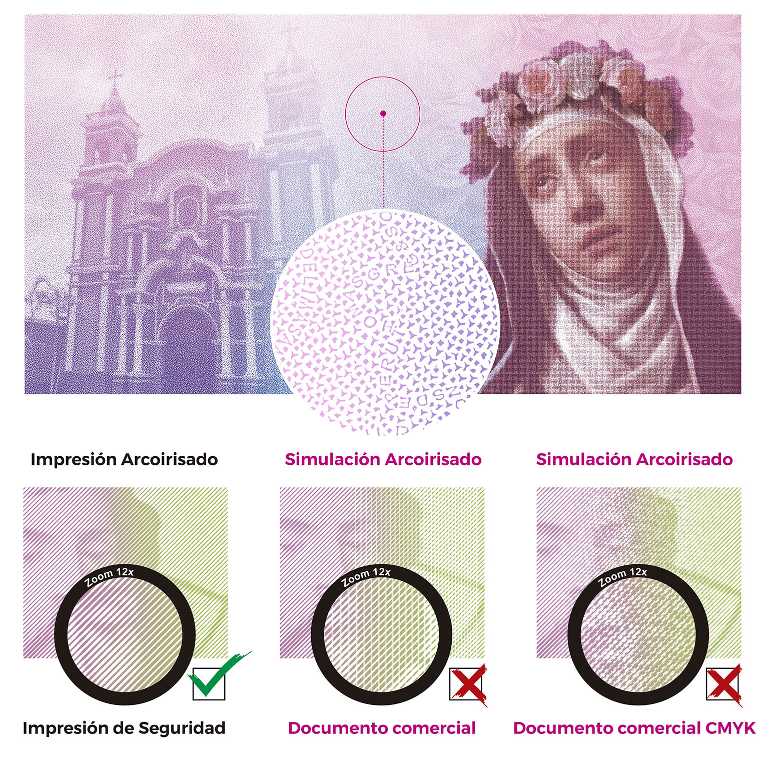 Proceso de coloración utilizado en la impresión offset que sirve para proteger los documentos de seguridad de la separación de colores o de la copia, ya que los colores se van fundiendo suavemente unos con otros logrando un cambio de color gradual. NTP 620.001 Seguridad documentaria. Glosario -INACAL. Definiciones adicionales Técnica mediante la cual se imprimen simultáneamente dos o más colores de tinta en la misma unidad sobre una prensa para crear una combinación sutil de los colores que da como resultado un cambio de color gradual. La organización internacional de normalización (ISO).ISO/IEC 18013-1-2018 Information technology - personal identification-ISO-compliant driving licence. part.1 (pág. 43) El efecto de irisación es un procedimiento de coloración utilizado en la impresión offset; sirve para impedir la separación de colores o proteger de la copia los documentos de seguridad, ya que los colores se van fundiendo suavemente unos con otros logrando un cambio de color gradual. Consejo de la unión europea - Registro público de documentos auténticos de identidad y de viaje en Red - Prado - Glosario 2018(pág. 22) |